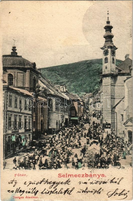 Leírás: 1902 Selmecbánya, Banská Stiavnica; Fő tér, piac, Singer Ignátz üzlete. Joerges / main square, market, shop (EK)