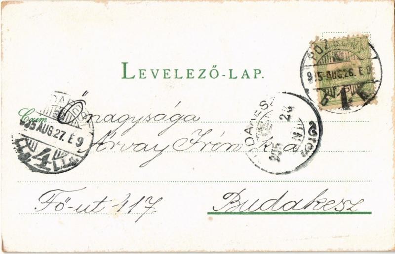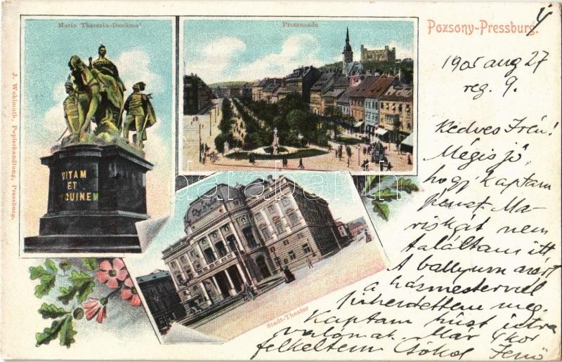Leírás: 1905 Pozsony, Pressburg, Bratislava; Mária Terézia szobor, sétány, színház. J. Wohlmuth kiadása / statue, promenade, theatre. Art Nouveau, floral