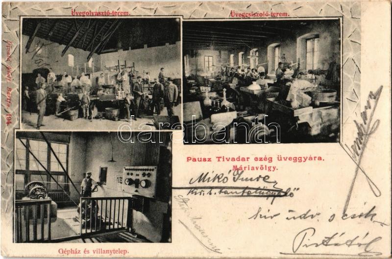 Leírás: 1911 Máriavölgy, Sárosmáriavölgy (Kőtelep, Kruzslyó, Kruzlov); Pausz Tivadar üveggyára, üvegolvasztó és üvegcsiszoló terem, gépház és villanytelep, belső. Divald Adolf 194. / glass factory, interior, engine house, power plant, workers. Art Nouveau
