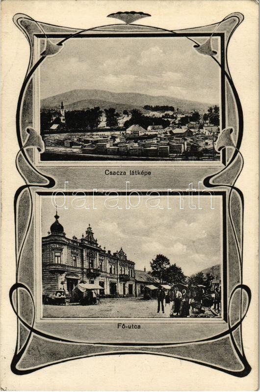 Leírás: 1915 Csaca, Csacza, Cadca, Caca; fűrésztelep, Fő utca, piac, Reich szálloda. Taub Emil kiadása / sawmill, main street, market, hotel. Art Nouveau + "K.u.K. Militärzensur Zsolna"