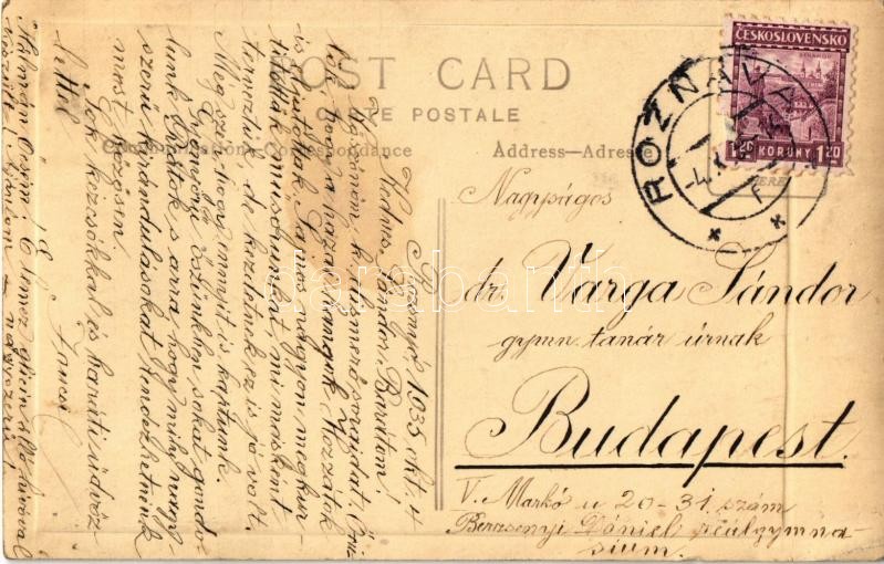 1935 Rozsnyó, Roznava; Kapu alj, Erzsébet királyné (Sissi) szobra, utcai árus, Schwarcz üzlete, dohányáruda és parfüméria / Sisi statue, shops, tobacco and perfumery. photo (fl)