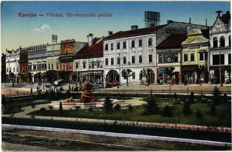 Eperjes, Presov; Fő utca, törvényszéki palota, Párisi Ruha Nagy áruház, cipő és kalap gyári raktár, Cattarino Sándor, Ambrózy Béla és Gerő Mihály üzlete / main street, court palace, shops