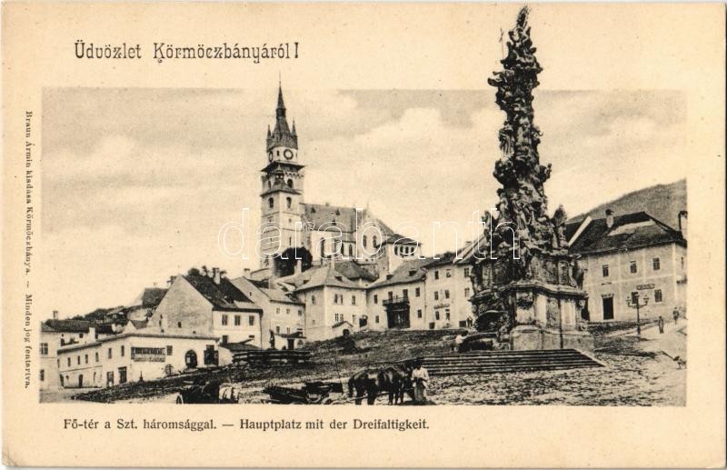Leírás: Körmöcbánya, Kremnitz, Kremnica; Fő tér, Szentháromság szobor. Braun Ármin kiadása / Hauptplatz, Dreifaltigkeit / main square, Trinity statue