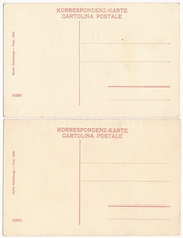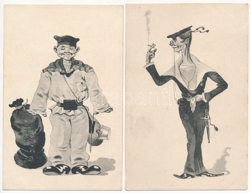 2 db régi osztrák-magyar haditengerészeti humoros művészlap, Dworak stílusban / K.u.K. Kriegsmarine Matrosen / 2 pre-1945 Austro-Hungarian Navy mariner art postcards, Dworak style. Guido Costalunga Pola 1909. 16200/16202.