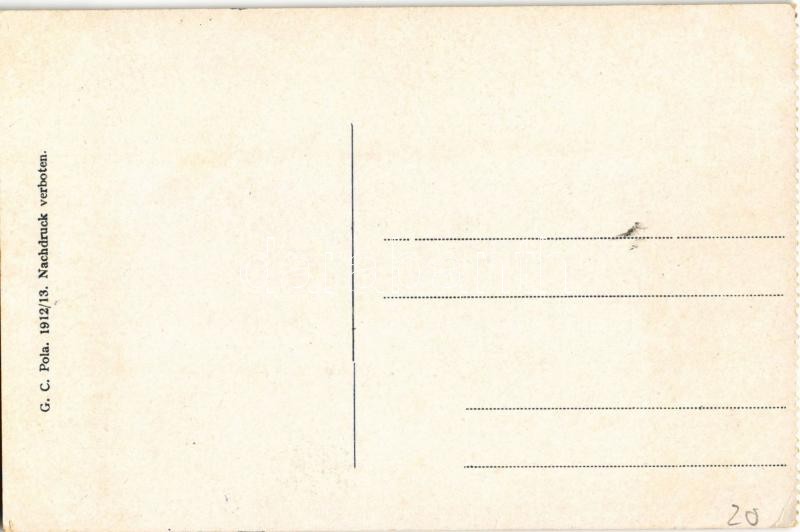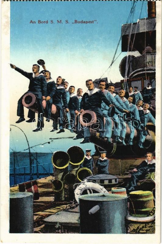 An Bord SM Schiff "Budapest" K.u.K. Kriegsmarine / SMS Budapest az Osztrák-Magyar Haditengerészet Monarch-osztályú partvédő csatahajója (Pola és Trieszt védelmét látta el), matrózok az ágyúcsövön ülnek / Austro-Hungarian Navy, Monarch-class coastal defense ship (Pula and Trieste), mariners sitting on the cannons. G.C. Pola 1912/13.