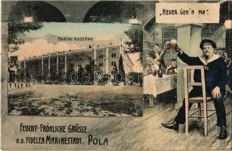 Leírás: Pola, Pula; K.u.K. Kriegsmarine Marine Kaserne, Feucht-Fröhlich Grüsse a.d. fidelen Marinestadt. "Neur Geh'n ma." / Austro-Hungarian Navy barracks, montage with mariner drinking beer. G. Costalunga / Osztrák-magyar haditengerészeti laktanya, montázs sörivó matrózzal (fl)