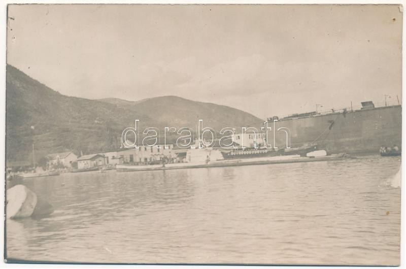 SM U-3 vagy U-4 (U-III és U-IV) Germania-típusú Osztrák-Magyar Haditengerészet tengeralattjáró matrózokkal a fedélzeten a kikötőben / K.u.K. Kriegsmarine Unterseeboot U-3 oder U-4 / Austro-Hungarian SM U-3 or SM U-4 submarine with mariners on board at the port. photo (apró lyuk / tiny pinhole)
