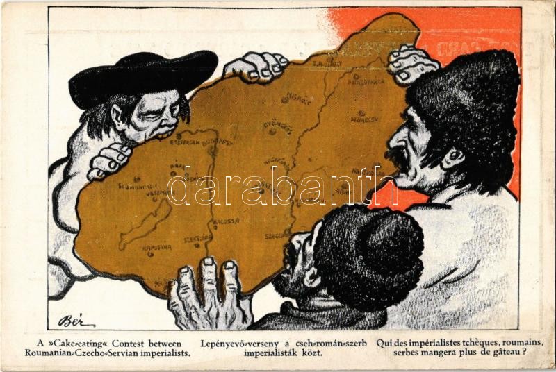 Lepényevő verseny a cseh-román-szerb imperialisták közt / A cake-eating contest between Romanian-Czech-Serbian imperialists. Hungarian irredenta art postcard s: Bér (Rb)