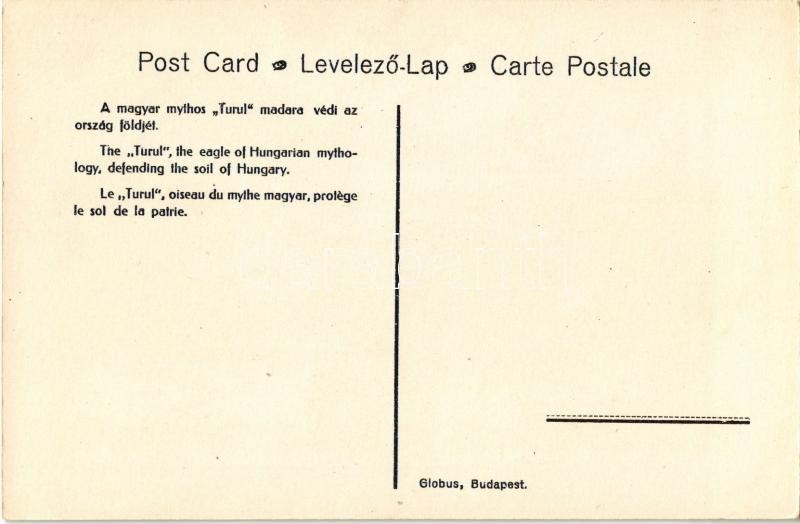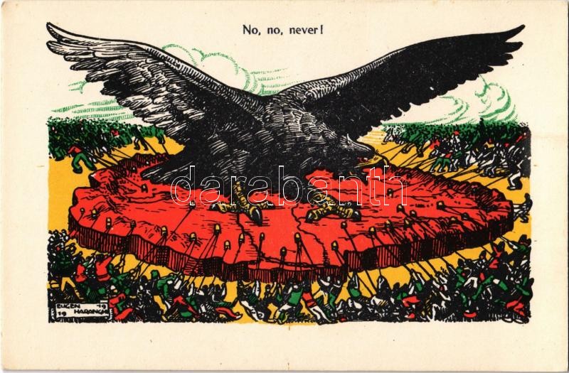 Leírás: No, no, never! A magyar mythos "Turul" madara védi az ország földjét / Hungarian Irredenta art postcard s: Eugen Haranghy