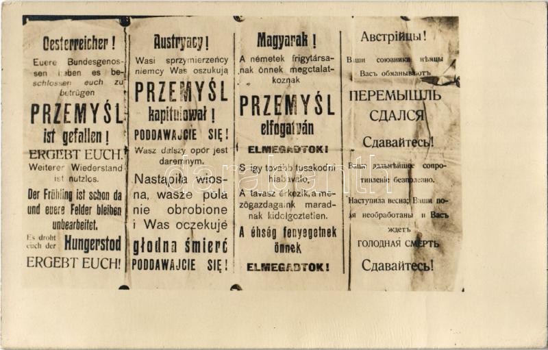 Magyarak! A németek frigytársanak önnek megotalatkoznak Przemysl elfogatván elmegadtok! Az éhség fenyegetnek önnek elmegadtok! Első világháborús katonai propaganda plakát négy nyelven (osztrák, lengyel, magyar, orosz) / WWI K.u.K. military propaganda poster in 4 languages (Austrian, Polish, Hungarian and Russian). photo