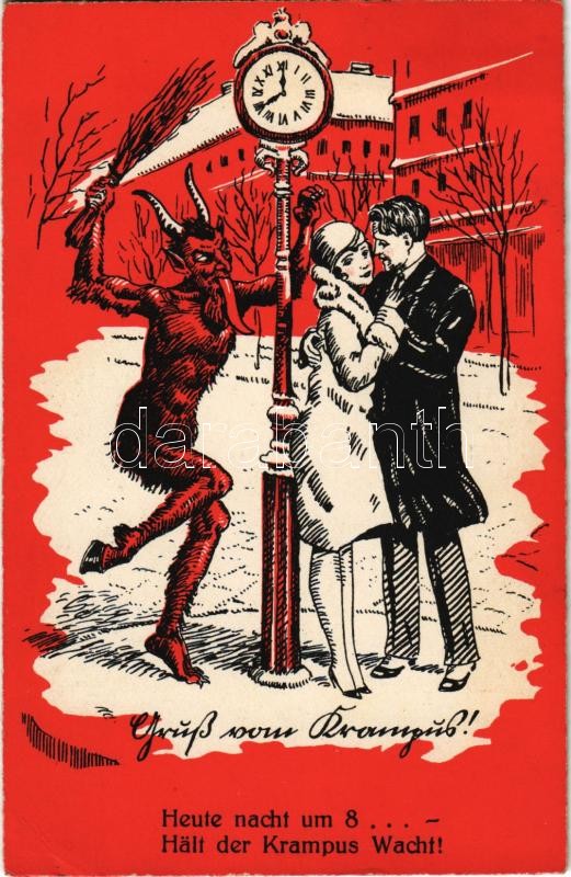 1936 Gruss vom Krampuss! Heute nacht um 8... - Hält der Krampus Wacht!... https://www.darabanth.com/hu/33-Nagyaukcio/33.1/Kepeslapok/Krampusz~13989/1936-Gruss-vom-Krampuss-Heute-nacht-um-8-Halt-der-Krampus-Wacht-Krampus-with-couple-Erika~II2108002