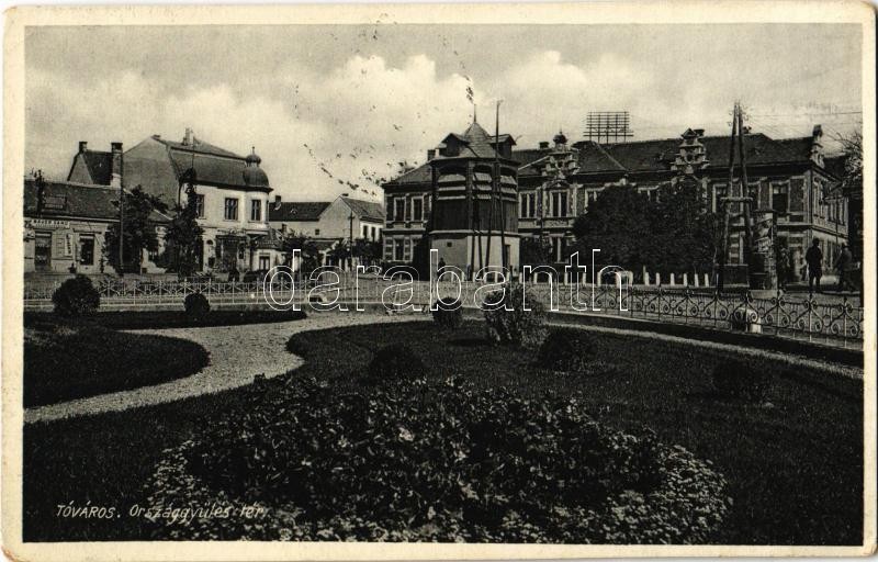 Leírás: 1939 Tata-Tóváros, Tatatóváros; Országgyűlési tér, Harangláb, cukrászda, Mohácsy A. és Bauer Samu üzlete (EK)