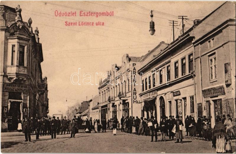 Leírás: Esztergom, Szent Lőrinc utca, Párisi áruház, Popper és Leier, Vörös József, Deutsch Mór Pollák Lipót és fia és ifj. Földes Nándor üzlete. W.L. 135.
