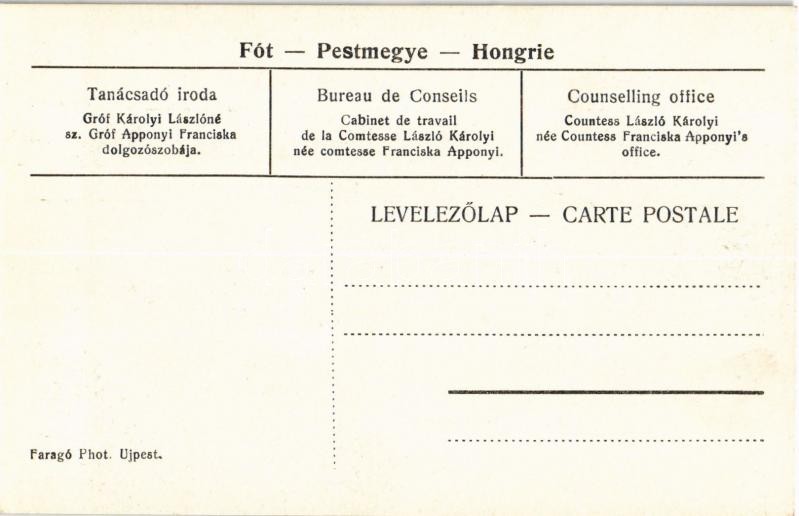 Fót, Népjóléti Intézmény, Tanácsadó iroda, Gróf Károlyi Lászlóné szüle... https://www.darabanth.com/hu/33-Nagyaukcio/33.1/Kepeslapok/Magyarorszag~13900/Fot-Nepjoleti-Intezmeny-Tanacsado-iroda-Grof-Karolyi-Laszlone-szuletett-Grof-Appon~II2135792