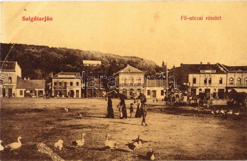 Salgótarján, Fő utca, zsinagóga, L. György, Löwy Mór, Blau Markusz, Rosenberg Sándor és Biheller Jakab üzlete, kút vizes kocsival, Friedler Ármin könyvkötészete, könyvnyomdája és saját kiadása. W.L. (?) 84.