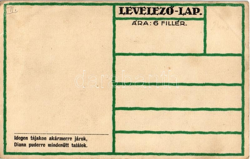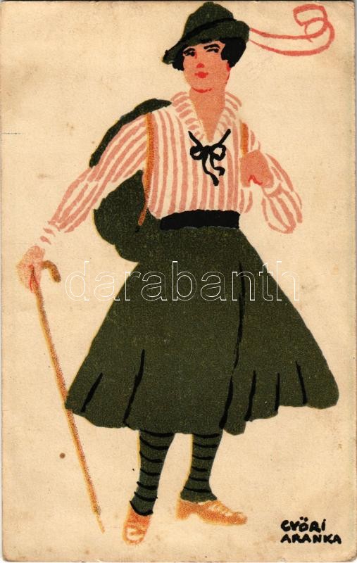 Leírás: Ungarische Werkstätte, kiránduló hölgy; Diana sósborszesz / Hungarian art postcard, hiking lady. Advertisement on the backside s: Győri Aranka