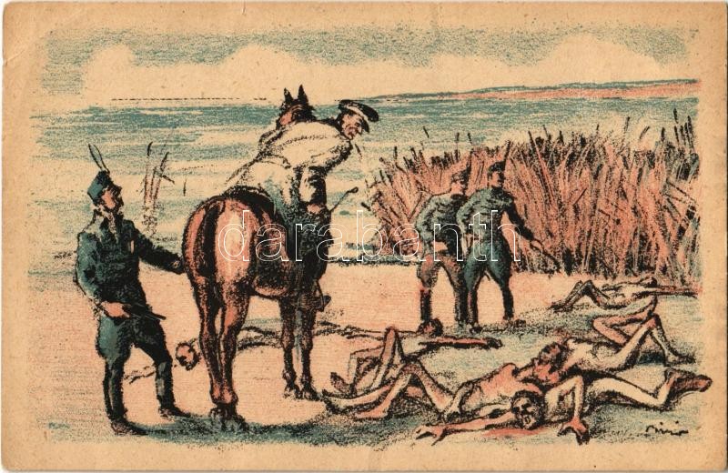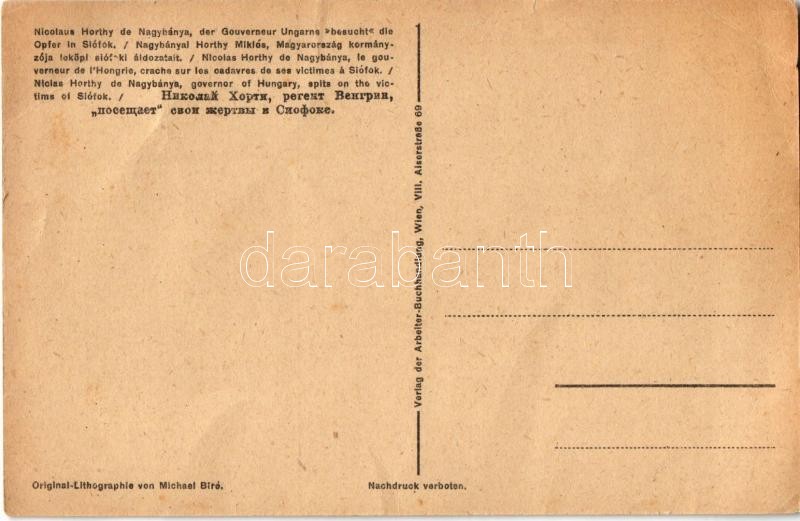 Nagybányai Horthy Miklós, Magyarország kormányzója leköpi siófoki áldozatait! Fehérterror Magyarországon. Verlag der Arbeiter-Buchhandlung / White Terror in Hungary, left-wing propaganda card, Judaica s: Bíró (EB)