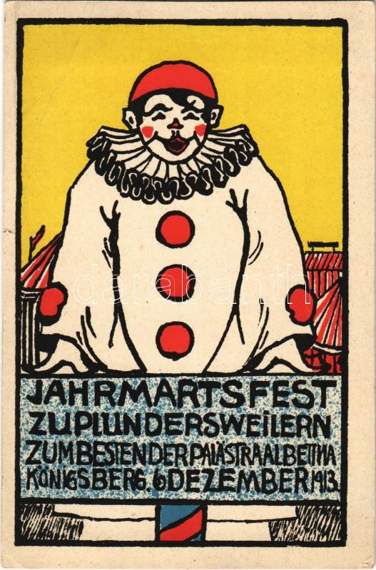 1913 Königsberg, Jahrmarktsfest zu Plundersweilern zum Besten der Palä... https://www.darabanth.com/hu/33-Nagyaukcio/33.1/Kepeslapok/Reklam~13997/1913-Konigsberg-Jahrmarktsfest-zu-Plundersweilern-zum-Besten-der-Palastra-Albertina-Lehrwerksta~II2108037