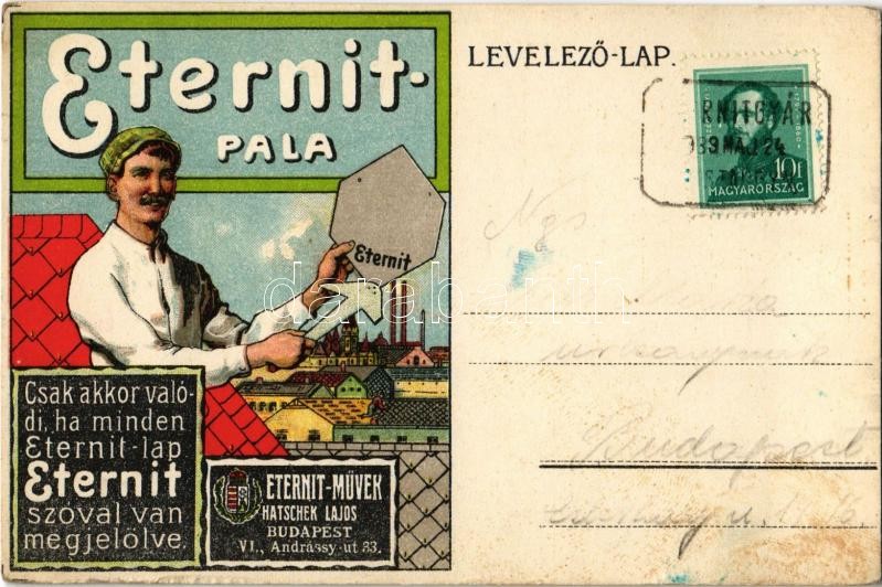 1939 Eternit-Pala. Hatschek Lajos Eternit-Művek reklámlapja / Hungaria... https://www.darabanth.com/hu/33-Nagyaukcio/33.1/Kepeslapok/Reklam~13997/1939-Eternit-Pala-Hatschek-Lajos-Eternit-Muvek-reklamlapja-Hungarian-roof-tile-advertisement-ca~II2143232
