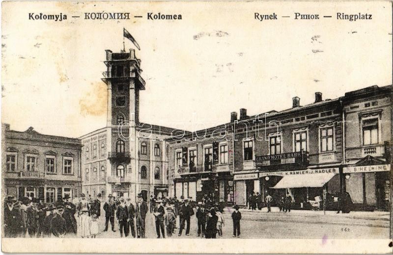 1915 Kolomyia, Kolomyja, Kolomyya, Kolomea; Rynek / square, Grand Hotel Bahr, shops of B. Helwing, K. Ramler, J. Nadler + "K.u.K. Zensorkommission Czernowitz" (EK)