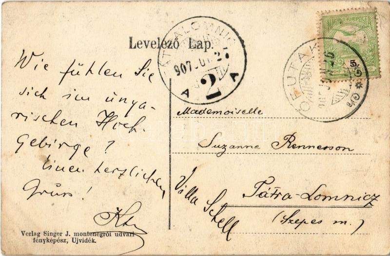 1907 Futak, Futtak, Futog; Rudolfinum zárda iskola, Marianum kórház, Hadik kastély, Vásár tér, Újfutaki Fő utca, Vasútállomás, vasutasok. Singer J. montenegrói udvari fényképész kiadása / nunnery, school, hospital, castle, marketplace, main street, railway station, railwaymen (enyhén ázott sarok / slightly wet corner)