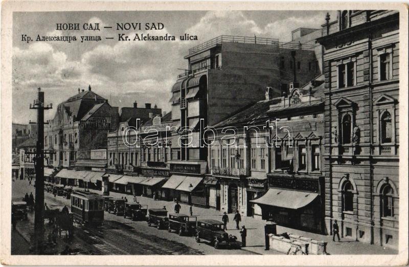 1941 Újvidék, Novi Sad; Sándor király út, taxik, villamos, Dunderou és Kesler üzlete, bank / Kr. Aleksandra ulica / street, taxis, tram, shops, bank + "M. Kir. I. Ferencz József-Jászkun 1. honvéd huszárezred parancsnokság Ellenőrizve"
