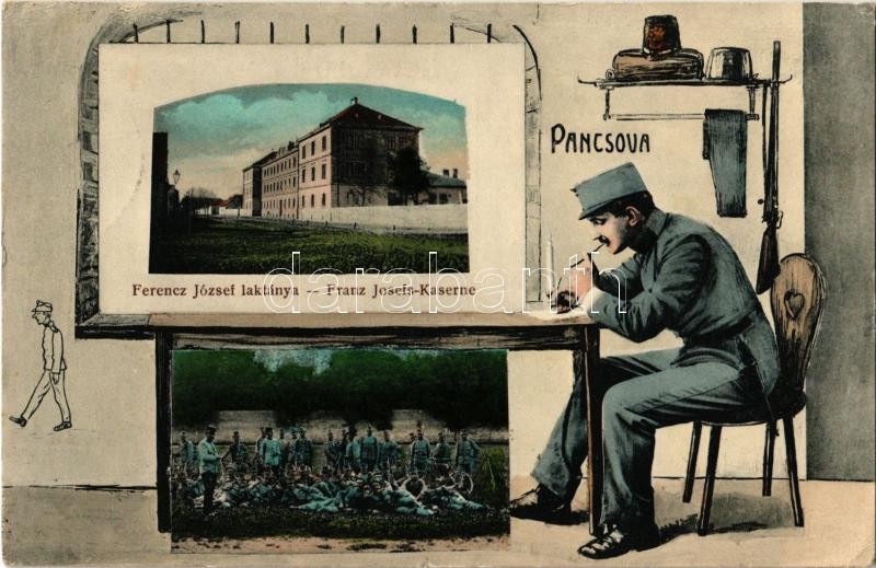 Pancsova, Pancevo; Ferenc József laktanya. Montázs levelet író katonával, Krausz Adolf kiadása / Franz Josefs Kaserne / military barrack. Montage with soldiers (EK)