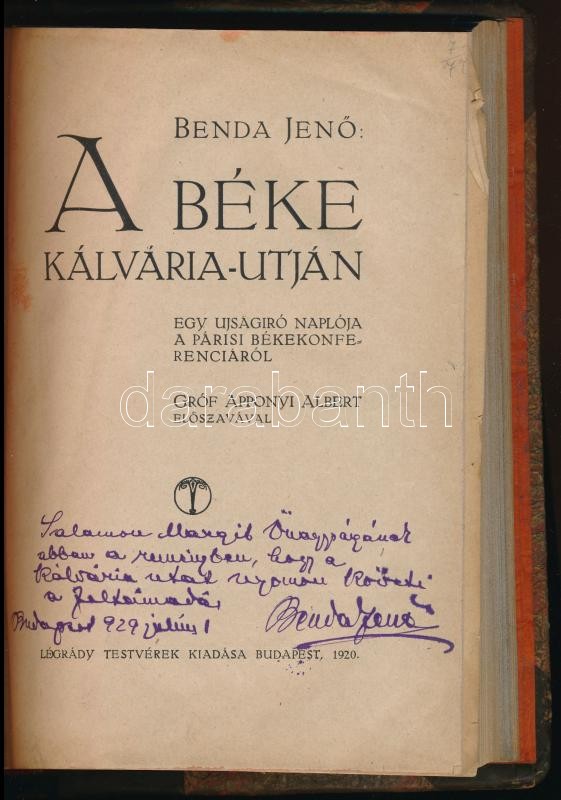 Benda Jenő: A béke kálvária-útján. Egy ujságíró naplója a Párisi békekonferenciáról. Gróf Apponyi Albert előszavával. Bp., 1920, Légrády, 260 p. Bordázott gerincű félbőr-kötésben, kopott borítóval két kijáró lappal. A szerző által dedikált.