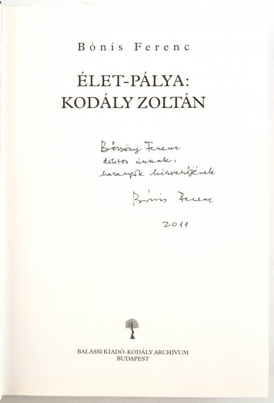 Bónis Ferenc: Élet-pálya Kodály Zoltán. Bp.,2011,Balassi Kiadó-Kodály Archívum, 726+2 p. Gazdag szövegközti képanyaggal illusztrált. Kiadói egészvászon-kötés, kiadói papír védőborítóban.