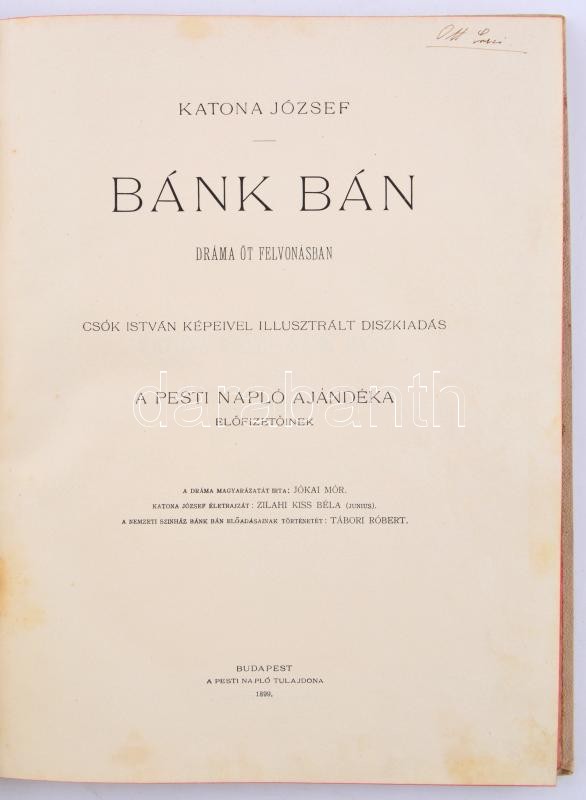 Katona József: Bánk bán. Dráma öt felvonásban. Csók István képeivel illusztrált díszkiadás. A Pesti Napló ajándéka előfizetőinek. Bp., 1899, Pesti Napló,