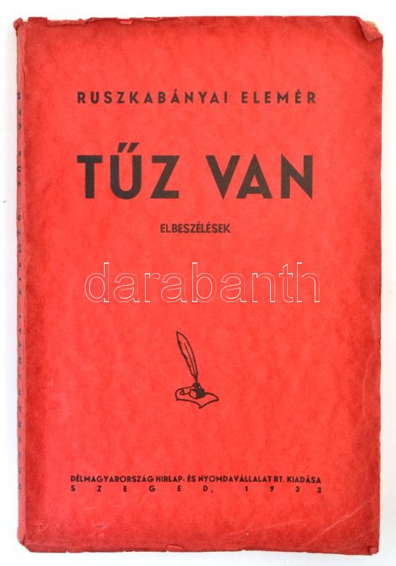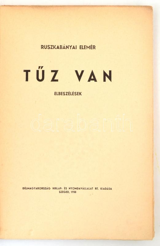 Ruszkabányai Elemér: Tűz van. Elbeszélések. Szeged, 1933., Délmagyarország Hírlap és Nyomdaivállalat Rt, 105 p. Kiadói papírkötés, kissé laza fűzéssel. A szerző által dedikált.