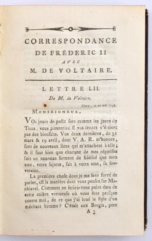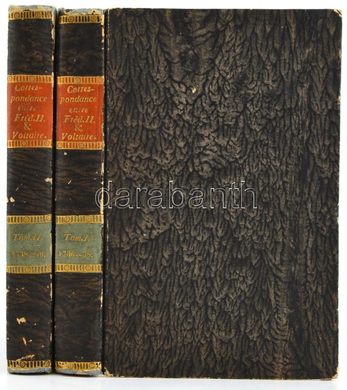Oeuvres posthumes de Frederic II, roi de Prusse. Correspondance avec M. de Voltaire. Tome I-II. Amsterdam, 1789.,(ny.n.), 307;304 p. Francia nyelven. Korabeli kissé kopott kartonált papírkötésben, festett lapélekkel, jó állapotban. Ritka!/ Paperbinding, with little bit worn cover, in French language. Rare!