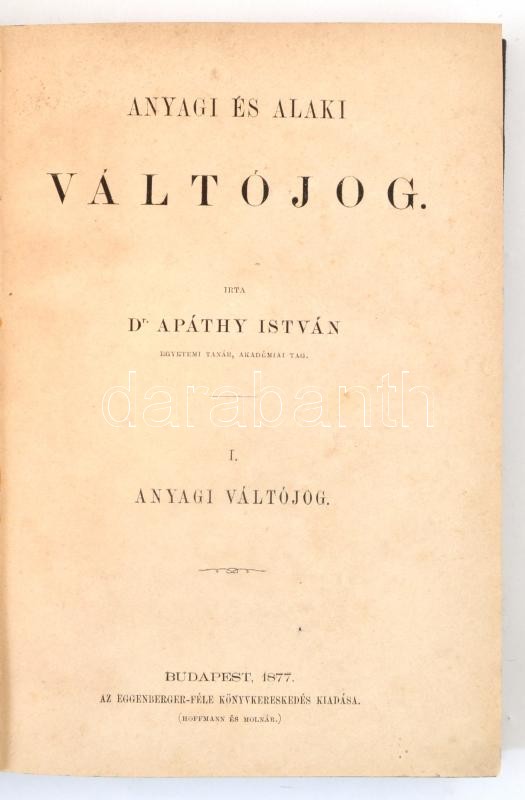 Dr. Apáthy István: Anyagi és alaki váltójog. I. köt. Anyagi váltójog. Bp., 1877., Eggenberger,(Athenaeum-ny.), XII+283 p. Átkötött félvászon-kötésben, kissé dohos, ceruzás aláhúzásokkal. Csak I. kötet. Ritka!.