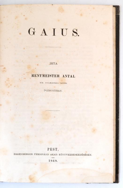 Rentmeister Antal: Gaius. Pest, 1869, Eggenberger, 116 p.+ 1 t. Később... https://www.darabanth.com/hu/33-Nagyaukcio/33.1/Konyvek/Konyvek-Jog~13879/Rentmeister-Antal-Gaius-Pest-1869-Eggenberger-116-pplus-1-t-Kesobbi-atkotott-felvaszon-kC3~II2128514