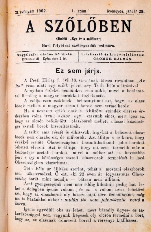 1899-1902 A Szőlőben. (Ezelőtt: "Egy év a szőlőben.") Havi folyóirat szőlősgazdák számára. VIII. évf. 6-12 sz. (fél évfolyam), IX. évf. 1-12. sz. (teljes évfolyam.), X. évf. 1-12 sz. (teljes évfolyam), XI. évf. 1-8. és 10-11. sz. (majdnem teljes évfolyam.) Összesen, két teljes, egy majdnem teljes és egy fél évfolyam. (Egybekötve.) Szerk.: Csomor Kálmán. Gyöngyös, 1899-1902, Kováts és Társa-Sima Dávid-ny.,81-192;192;192;1-128+145-192 p. Későbbi átkötött aranyozott gerincű félvászon-kötésben, az 1901-es évfolyamban egy lap sérült, hiányos (63/64.) és a 168-169. oldalak közé a Magyar Bortermelők Lapja egy lapját kötötték. +Scheffer Ede városi kertész 1900-as gyümölcs- és díszfa árjegyzékével, szakadozott, 2 sztl. lev. A lap a mátravidéki szőlősgazdák közlönye volt. 14 évfolyama jelent meg.