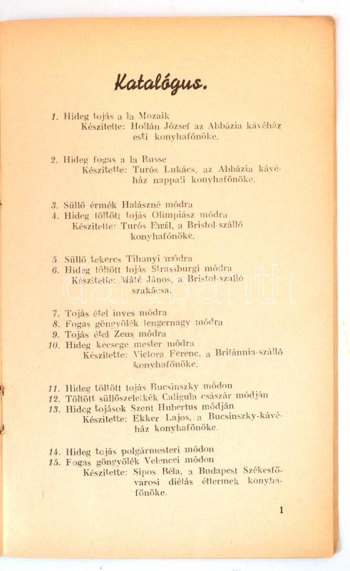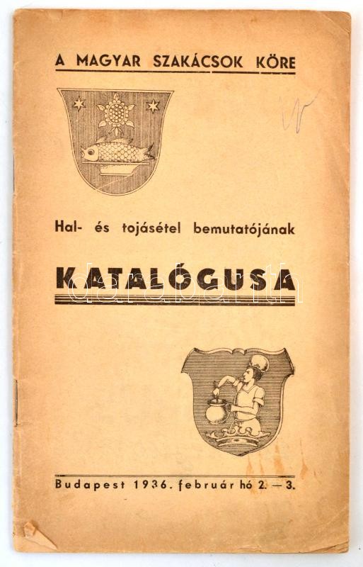 1936 Magyar Szakácsok Köre Hal- és tojásétel bemutatásának katalógusa. Budapest, 1936. feb. 2-3. Bp., 1936., Magyar Szakácsok Köre, (Hoffmann és Társa-ny.), XX+26 p. Korabeli reklámokkal. Kiadói papírkötés, a borítón kis szakadással.