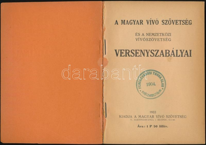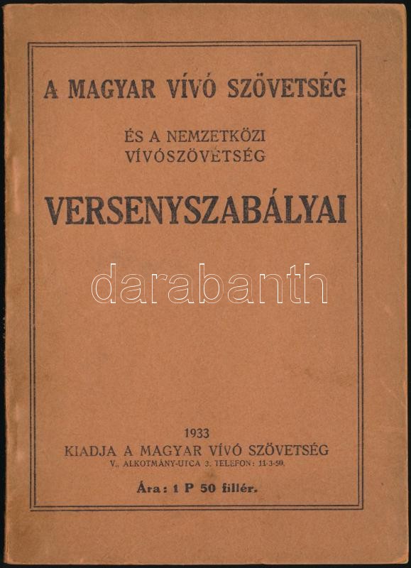A magyar vívó szövetség és a nemzetközi vívószövetség versenyszabályai. Bp., 1933, Magyar Vívó Szövetség, (Stádium-ny.), 104+12+IV p. Kiadói papírkötés, "FTC Vívószakosztálya 1904."