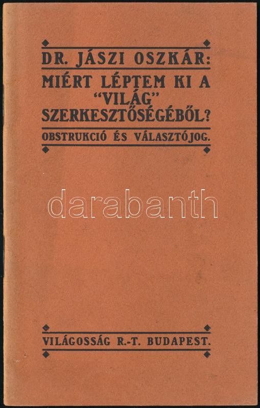 Dr. Jászi Oszkár: Miért léptem ki a "Világ" szerkesztőségébő... https://www.darabanth.com/hu/33-Nagyaukcio/33.1/Konyvek/Konyvek-Tortenelem~13880/Dr-Jaszi-Oszkar-Miert-leptem-ki-a-Vilag-szerkesztosegebol-Obstrukcio-es-valasztojo~II2111656