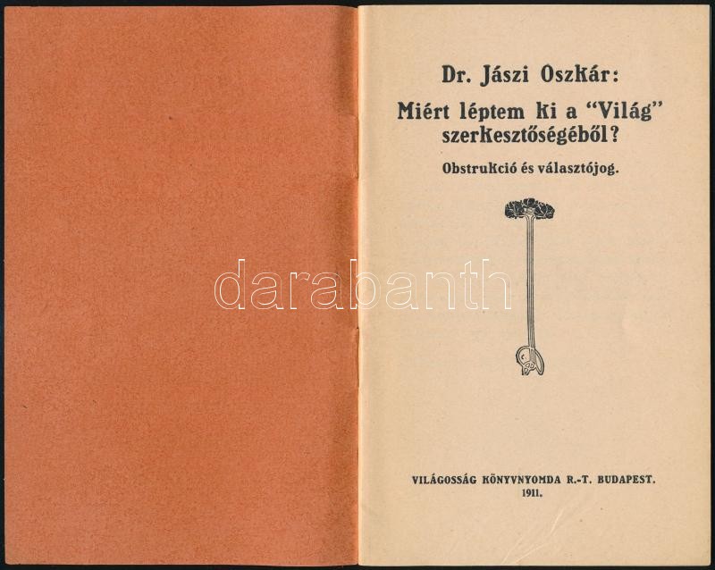 Leírás: Dr. Jászi Oszkár: Miért léptem ki a "Világ" szerkesztőségéből? Obstrukció és választójog. Bp., 1911, Világosság Rt., 32 p. Kiadói papírkötésben.