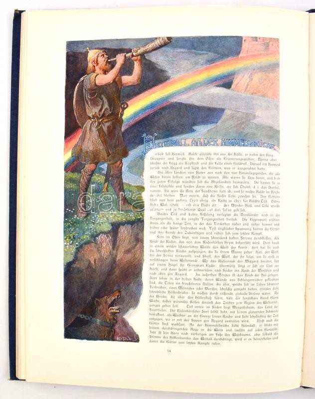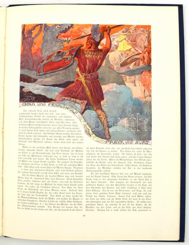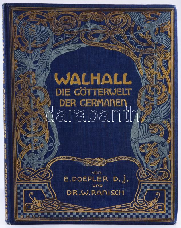 E. Doepler D.J.-Dr. W. Ranisch: Walhall Die Götterwelt der Germanen. Berlin, ,Martin Oldebourg, 59+5 p. DÃszes, szövegközti illusztrációkkal. Német nyelven. Kiadói aranyozott, festett egészvászon-kötés, kissé kopott borÃtóval, jó állapotban. / With lot of Illustrations. In German language. Gilt, coloured linen-binding, with little bit worn cover, in good condition.