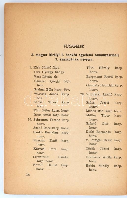 A kiadó előszavával és a szerző utóhangjával kiegészített kötet. Függelékként a M. Kir. I. Egyetemi Rohamzászlóalj 1. századának névsorával. Bp.,(1945), Müller Károly, Légrády. Első kiadás. Kiadói papírkötésben, kopott borítóval. /Paperbinding, with worn cover, in Hungarian language.