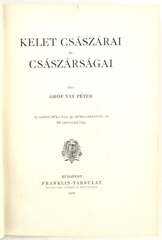 Vay Péter: Kelet császárai és császárságai. 17 színes műlappal, 50 műmelléklettel és 86 szövegképpel. Bp., 1906. Franklin-Társulat (Magyar Irodalmi Intézet ny.) 465 + [1] p. + 67 t. Első kiadás. Festett egészvászon kötésben, kopott, kissé foltos borítóval. / Empires and Emperors of the East (China, Japan and other countries) Linen binding, with worn and little bit spotty cover.