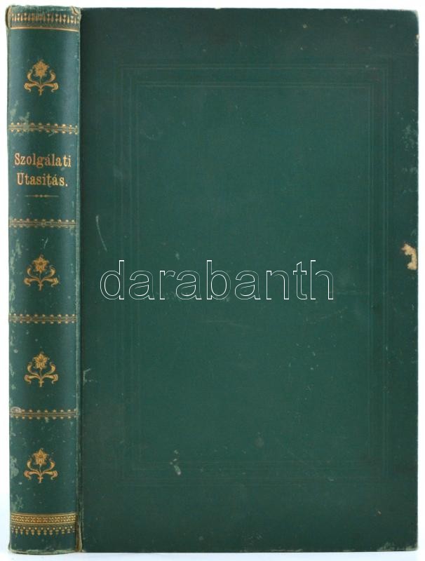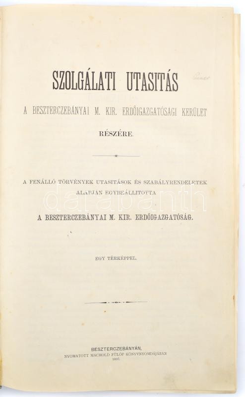 Szolgálati utasítás a Besztercebányai M. Kir. Erdőigazgatósági kerület részére. A fenálló törvények utasítások és szabályrendeletek alapján egybeállította a Besztercebányai M. Kir. Erdőigazgatóság. Besztercebánya, 1897, Machold Fülöp, 8+XL+703+1 p.+1 (kétoldalas, színes térkép, Bp., Posner. K. L. és Fia-ny., 32x39 cm.) Kiadói aranyozott gerincű egészvászon-kötés, márványozott lapélekkel, a borítón kopásnyomok, a gerincen kis sérülés, de belül jó állapotban.