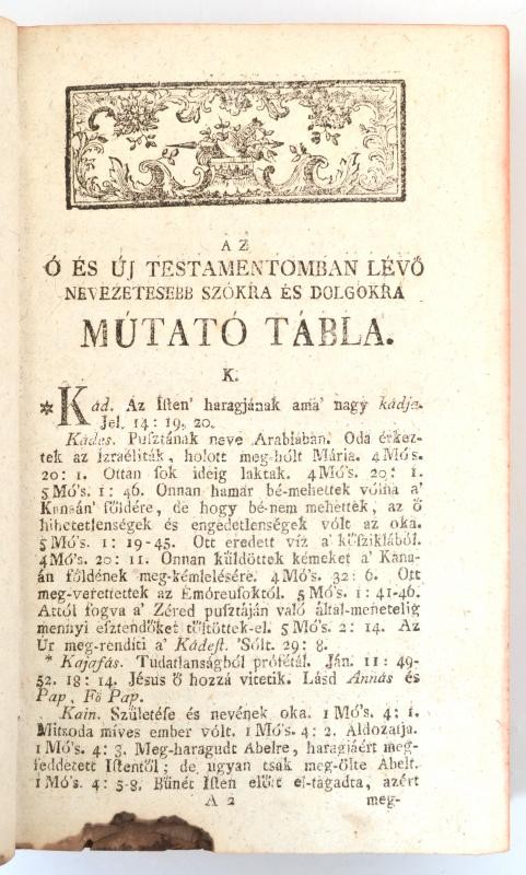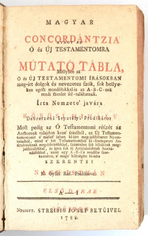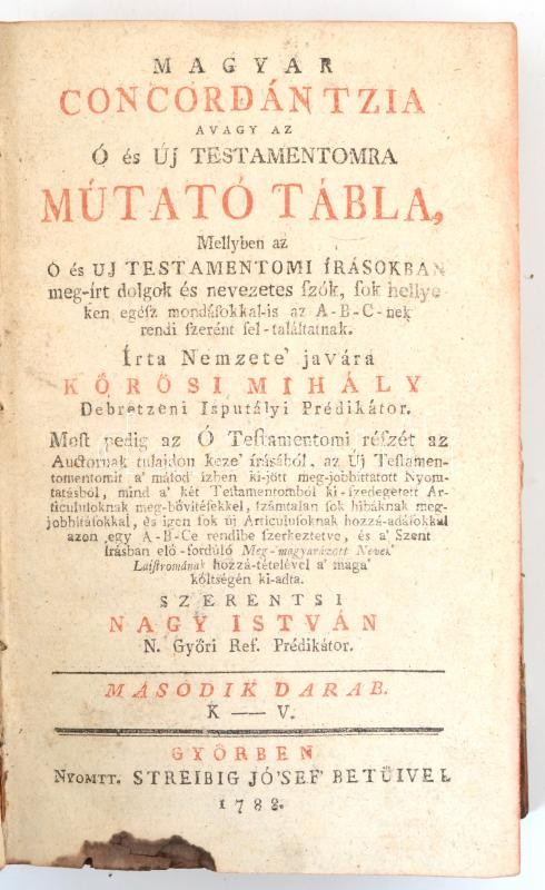 Kőrösi Mihály: Magyar concordántzia avagy az ó és uj testamtentomra mutató tábla, mellyben az ó és uj testamentomi irásokban meg-irt dolgok és nevezetes szók, sok hellyeken egész mondásokkal- is az ABC-nek rendi szerént fel-találtatnak. Irta nemzete javára .- -. Most pedig az ó testamentomi részét az auctornak tulajdon keze írásából, az uj testamentomit a másod izben ki-jött meg-jobbíttatott nyomtatásból, mind a két testamentomból kiszedegetett articulusoknak megbővítésekkel, számtalan sok hibáknak meg-jobbításokkal, és igen sok uj articulusoknak hozzá adásokkal, azon egy A-B-C-e rendibe szerkesztetve, a maga költségén kiadta Szerentsi nagy István. I-II. darab. Győr, 1788, Streibig József-ny., 12+ 586+14; 560+12+4+46+2 p. Az első kötet: korabeli kopott félbőr-kötésben, aranyozott címkével a gerincen, festett lapélekkel, gerincen sérülésekkel, az elülső szennylapon kis hiánnyal, az utolsó két lap kijár, a hátsó kötéstábla belsején a papír részben elvált, kissé dohos. Második kötet: korabeli aranyozott gerincű kopott félbőr-kötés, festett lapélekkel, a kötéstáblákon a papír részben elvált, a lapok alján folttal, ezen a részben pár lap sérült, kissé dohos.