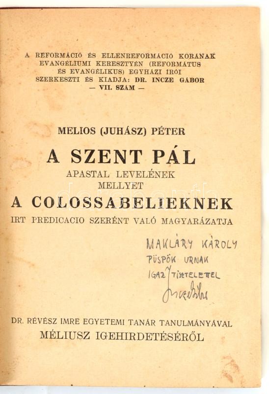 A sorozat szerkesztőjének (1935-1948), Dr. Incze Gábor (1898-1966) református lelkésznek a dedikációjával Makláry Károly (1876-1938) a Tiszántúli református egyházkerület püspöke (1936-1938), debreceni lelkész (1934-1938) részére.