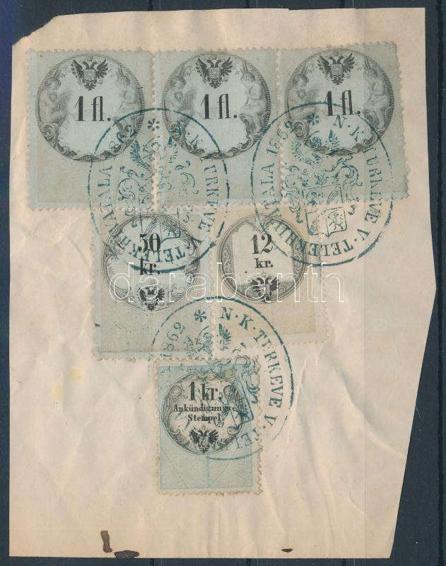 Leírás: 1858 Hirdetménybélyeg + 5 db szürke-kék papírú okmánybélyeg kivágáson "TURKEVE"
