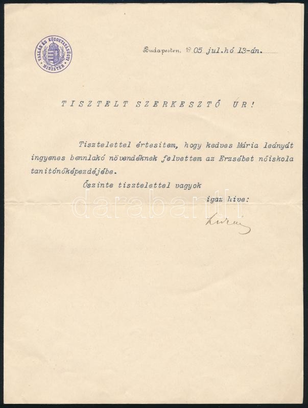 1905 Lukács György (1865-1950) vallás- és közoktatásügyi miniszter (1905-1906), jogász, főispán, országgyűlési képviselő aláírása egy felvételi értesítésen, vallás- és közoktatásügyi miniszter fejléces papírján