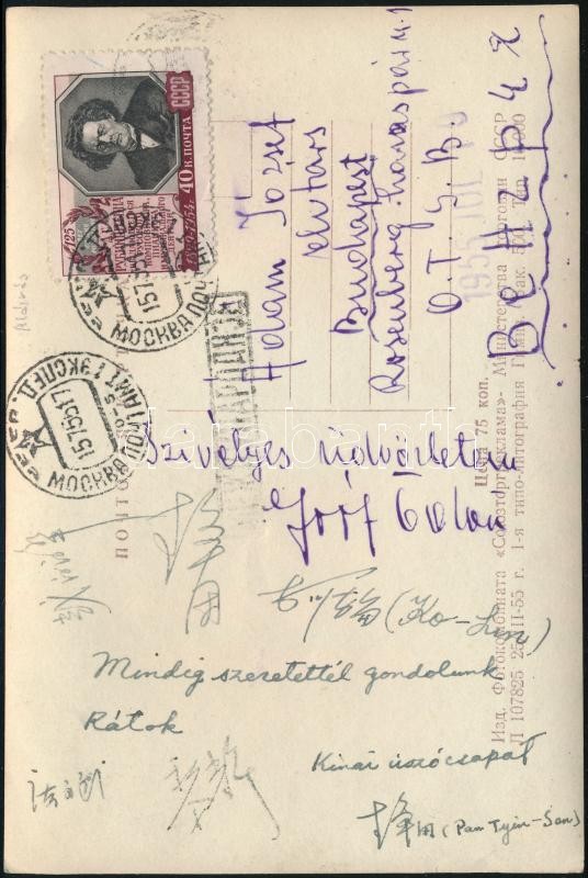 1951 Gróf Ödön Európa bajnok magyar úszó és a kínai úszócsapat (Ko-Lin, Pao-Tyin-Son) tagjainak aláírása Moszkvából küldött képeslapon / Hungarian and Chinese champion swimmer's autographs