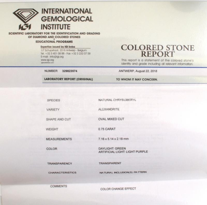 Alexandrit krizoberill 0,75 K.Színváltós zöld és lila. Ovális vegyes csiszolás. Tanúsítvánnyal, leírással / Alexandrite chrysoberill, color change effect 0,75 C 7,16x5,14x2,18 cm . Mixed oval cut. With certificate