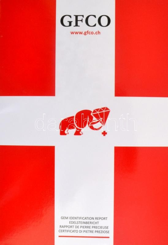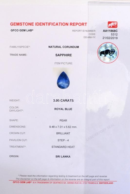Királykék zafír 3 K körte formájú, briliáns csiszolású. Tanúsítvánnyal, leírással / Sapphire.pear shape, royal blue 3 K. Briliant cut. With certificate 9,48x7,01x5,62 mm